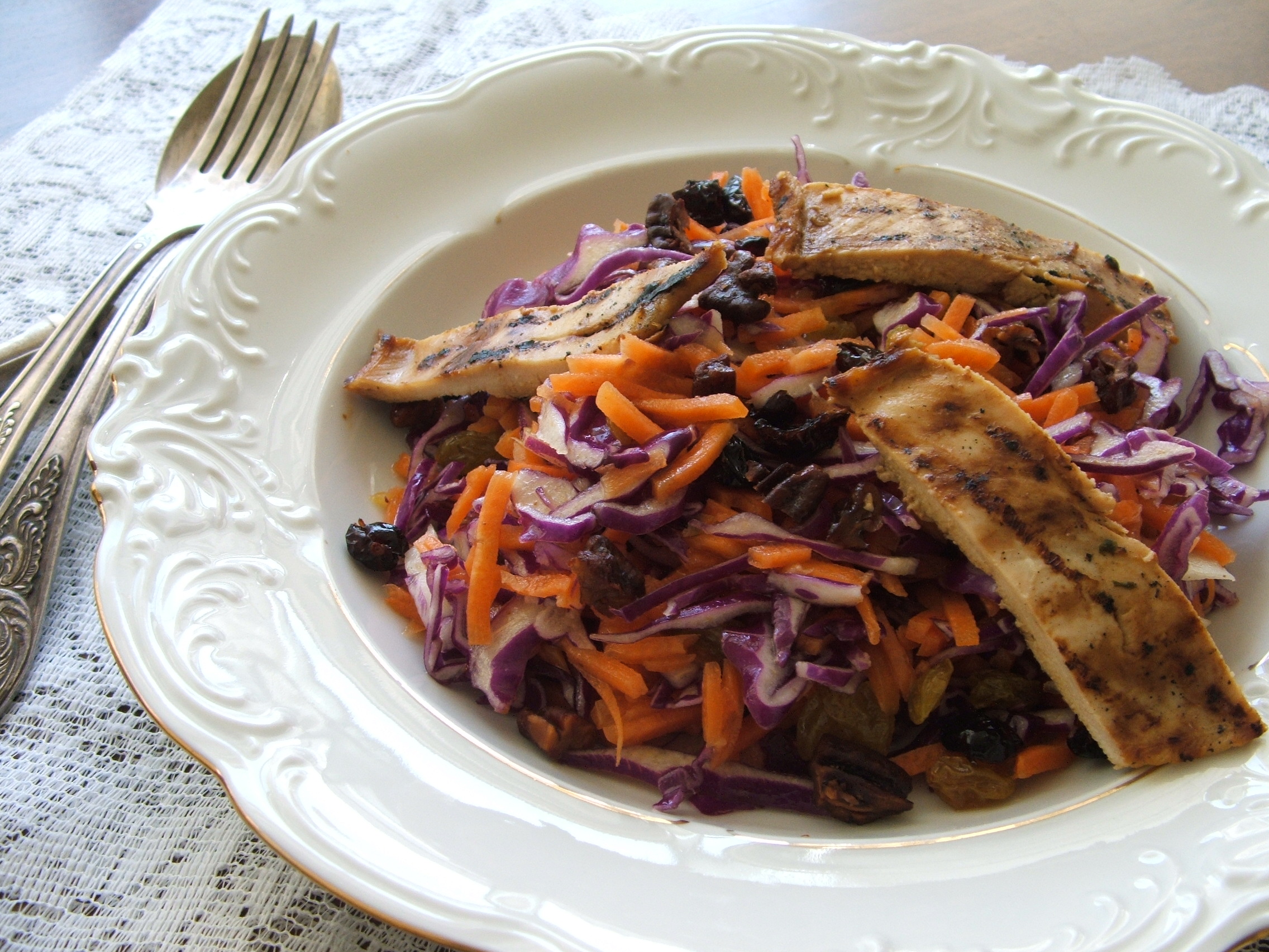 לחזה עוף במחבת (אני השתמשתי ב 3 חזות עוף שיועדו לשניצלים): מערבבים 3 שיני שום קצוצים עם 3 כפות שמן זית וקורט מלח. משרים את העוף לכ 15 דק' ( או לזמן שלוקח לשטוף, לקצוץ ולתבל את הסלט) . צולים את העוף במחבת עד שצבעו מלבין מ2 צדדיו והוא מוכן לאכילה. (ככה פשוט…) פורסים לרצועות ומוסיפים לסלט.