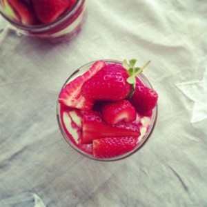 מוזגים את רוטב הדומדמניות ומפזרים מעל את רבעי התותים
