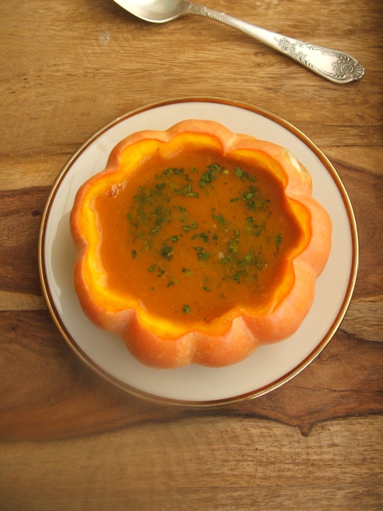 במסגרת שבוע השפעת הכנתי גם מרק -זרקתי הכל לסיר- עוף שלמרבה השמחה, וכמו תמיד, זכה  להצלחה אצל בני הבית הגדולים והקטנים יחדיו. אבל האמת היא ששיוועתי למרק כתום. אז אחרי שקצת התאוששתי זה מה שהכנתי. מרק דלעת בלי יותר מידי התעסקות אשר הוספתי לו קינמון וזנגוויל, הנחשבים למחממים. את המרק מגישים עם פסטו כוסברה ובשביל הרושם ניתן להגיש את המרק בתוך דלעת, כמו זאת שמצאתי  בשוק.